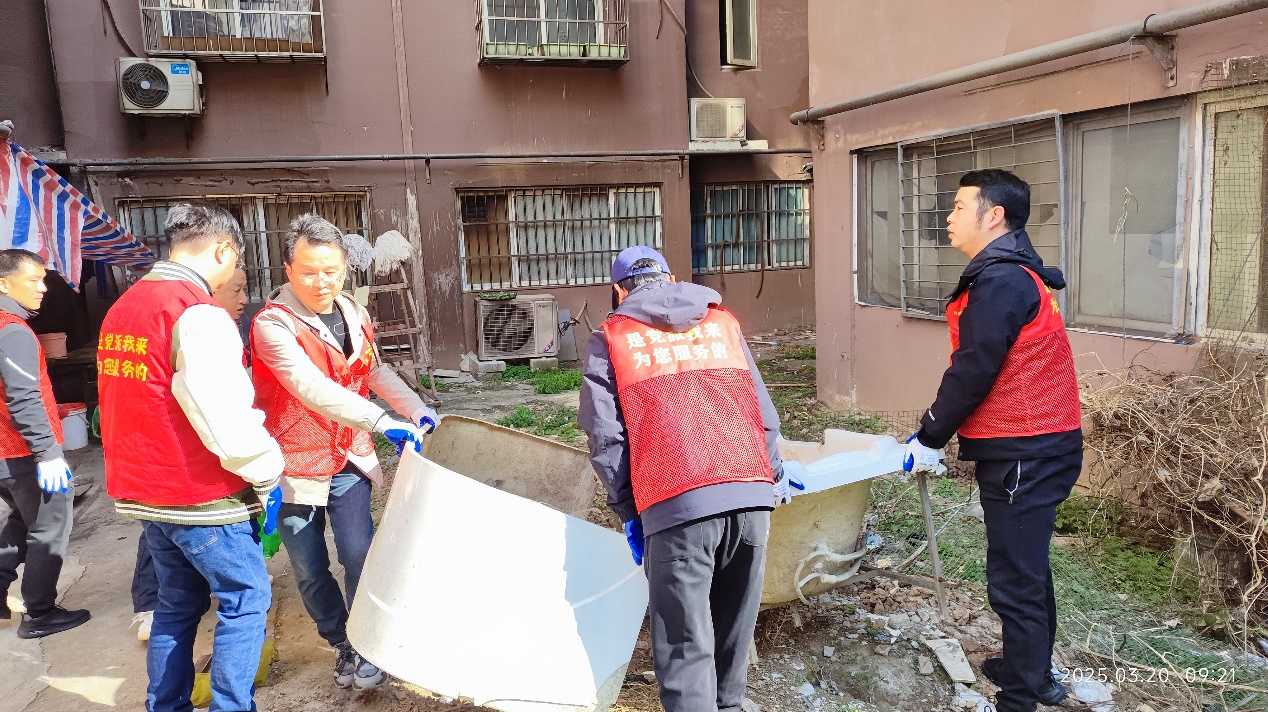活動現(xiàn)場,黨員志愿者分成多個小組,在社區(qū)開展環(huán)境衛(wèi)生清潔工作,大家齊心協(xié)力,認真細致地將小區(qū)樓道中的雜物、垃圾清掃干凈,充分展現(xiàn)不怕臟、不怕累的精神風貌,有效改善小區(qū)居住環(huán)境。